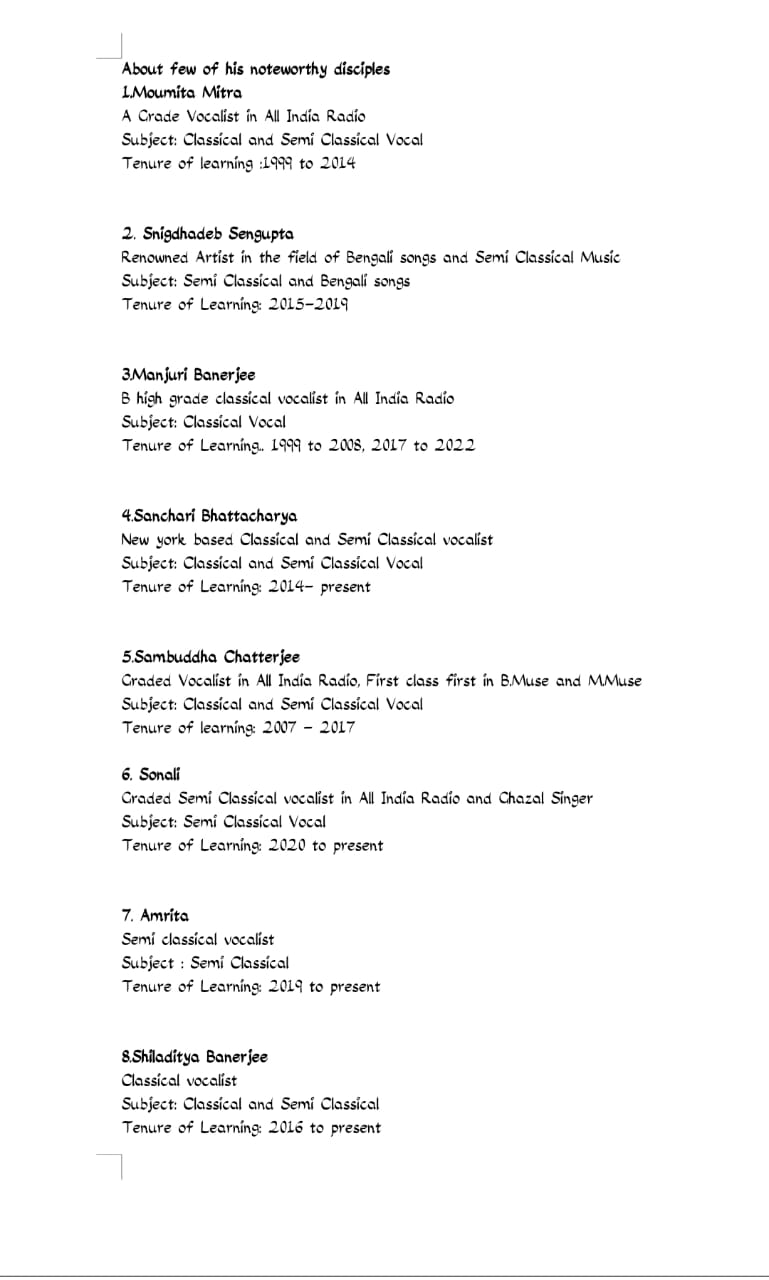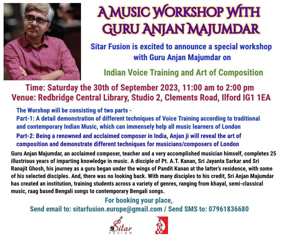Anjan Majumdar is one of the most respected and acclaimed gurus in the field of music today. His unique and effective teaching methods have helped many of his disciples to grow in stature and gain confidence. He initiated his journey as guru/mentor at a very early age during 1994/1995. In 1998 Guru Pandit A Kanan entrusted him with the responsibility to teach a few of his very promising young students...and since then there was no looking back for Anjan ji. His overall musical brilliance and rare quality to teach Classical vocal , Semiclassical vocal as well as Contemporary compositions simultaneously, make him so special as a mentor. He has many all India Radio graded (Akashvani graded) disciples to his credit and many of his disciples have given performances in prestigious concerts all over India and abroad. Many of them have been awarded with various awards, titles or Certificates of excellence. Many of his students have got grants in form of scholarship/ fellowship from Govt of India, under his tutelage. He has conducted Workshops as Guru / Mentor in Kolkata, Agartala, Dhaka as well as in London, Sheffield ( UK). In 2008, he was invited by Rauf- Ansari Foundation and APMC( All Pakistan Music Conference) in Pakistan as a Guru of Hindustani Classical Music. In 2022, during his tour to UK, he was felicitated as a Mentor of Hindustani Classical Music and as a Composer by the Ex Mayor of Leeds City in the Iconic Civic Hall . Recently, his disciples from various corners of India all came together to celebrate their Guru's (Anjan Majumdar Ji's) journey of 25+ years of mentorship. As a Guru/ Mentor he is equally effective and impactful in both online and offline formats.